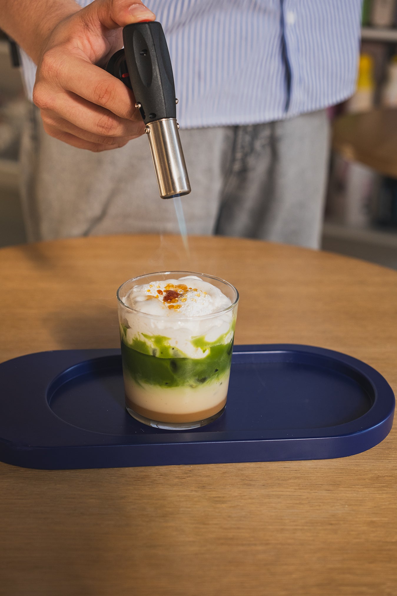 Orzeźwiająca Matcha Latte z chrupiącą skorupką crème brûlée.
