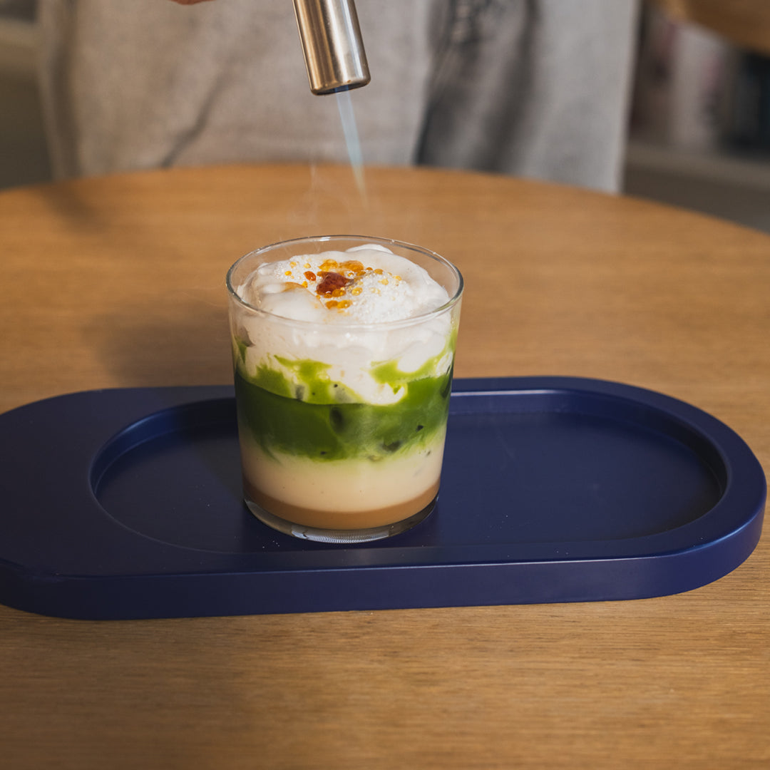 Orzeźwiająca Matcha Latte z chrupiącą skorupką crème brûlée.