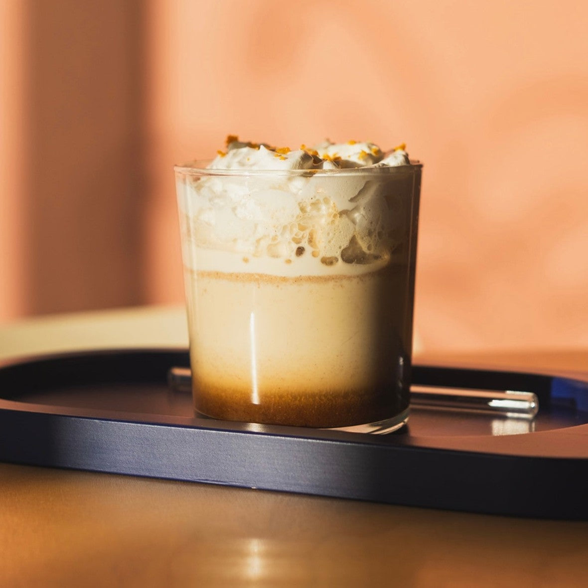 Mus z dojrzałej persymony spotyka głębię espresso, delikatność spienionego mleka i słodką śmietankę. Całość oprószona tartą persymoną