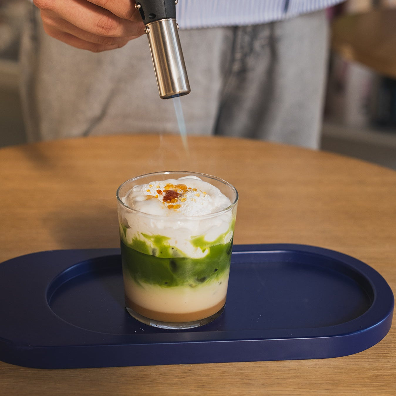 Orzeźwiająca Matcha Latte z chrupiącą skorupką crème brûlée.