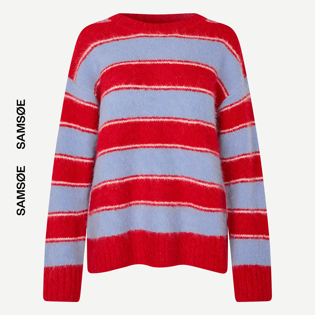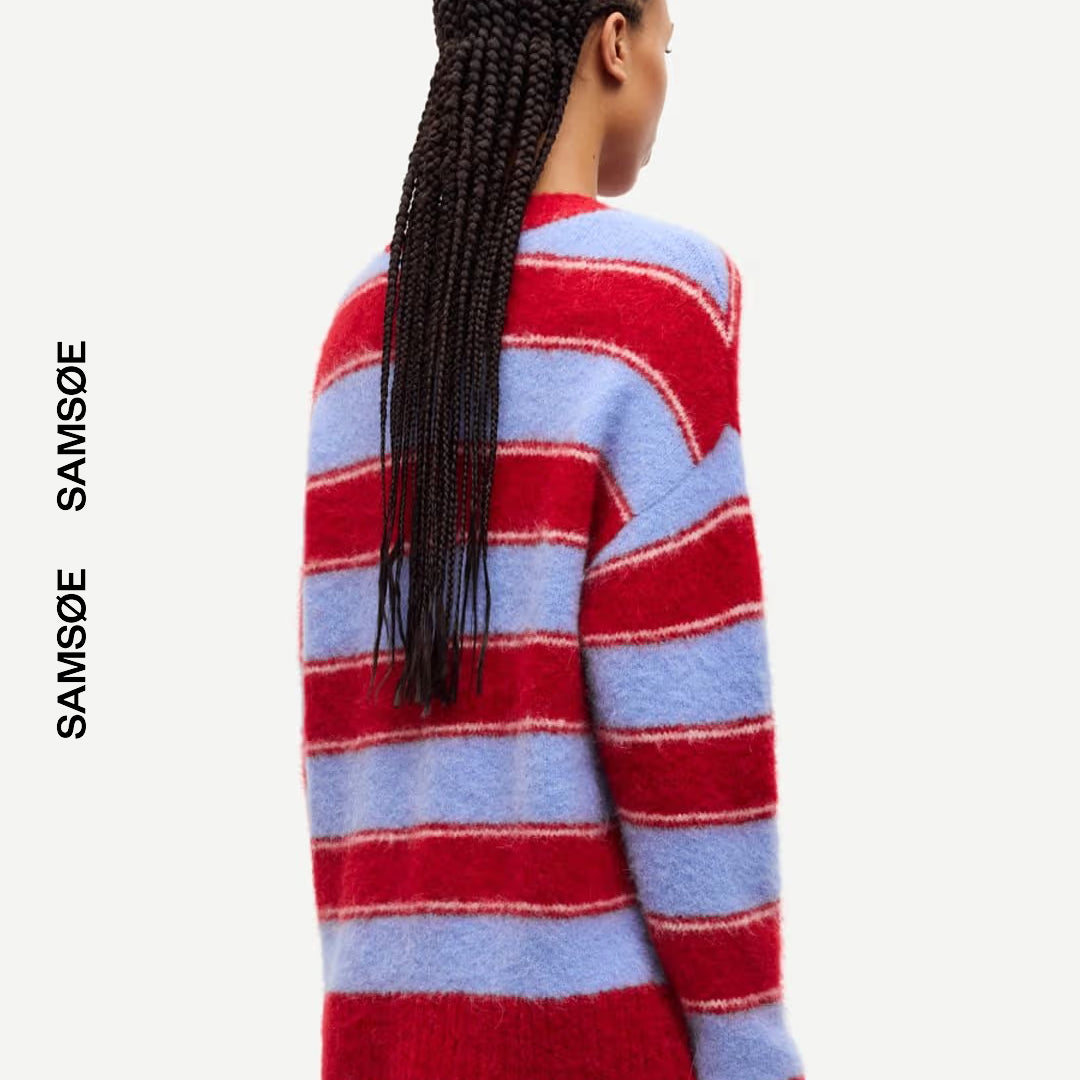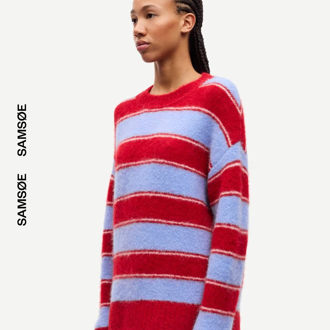 Sweter w paski SAMSØE SAMSØE ma obniżoną linię ramion, która dodaje mu swobodnego looku. Dzięki szczotkowanej fakturze i elastycznej mieszance materiałów z dodatkiem wełny alpaki jest wyjątkowo miękki i komfortowy. Załóż go do brązowych spodni, spódnicy lub skóry i zobacz jak rozświetla i "robi" całą stylizację.