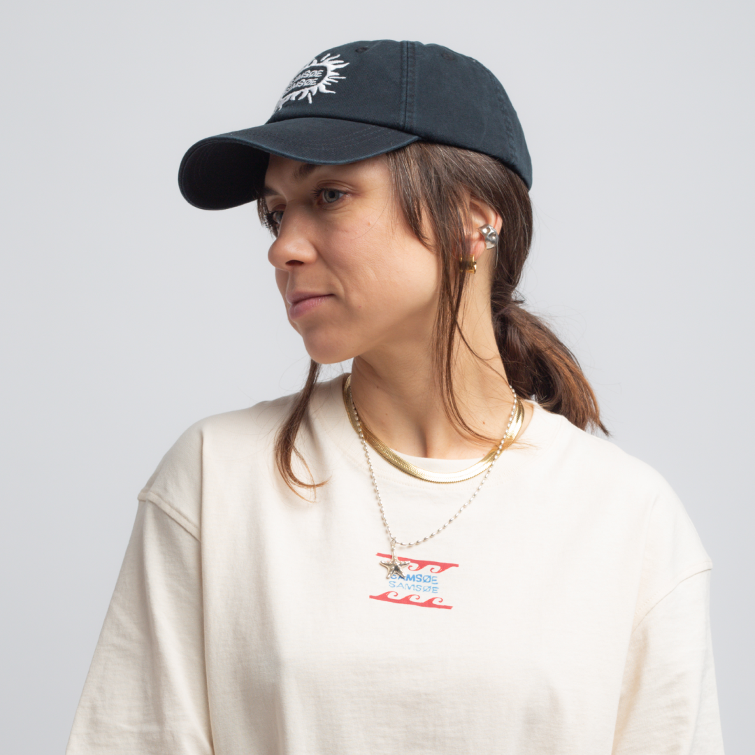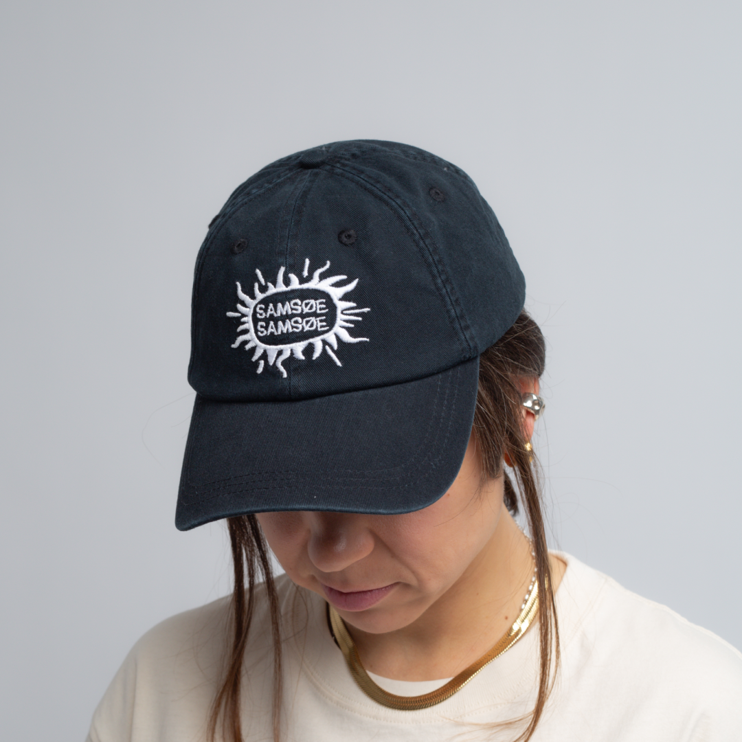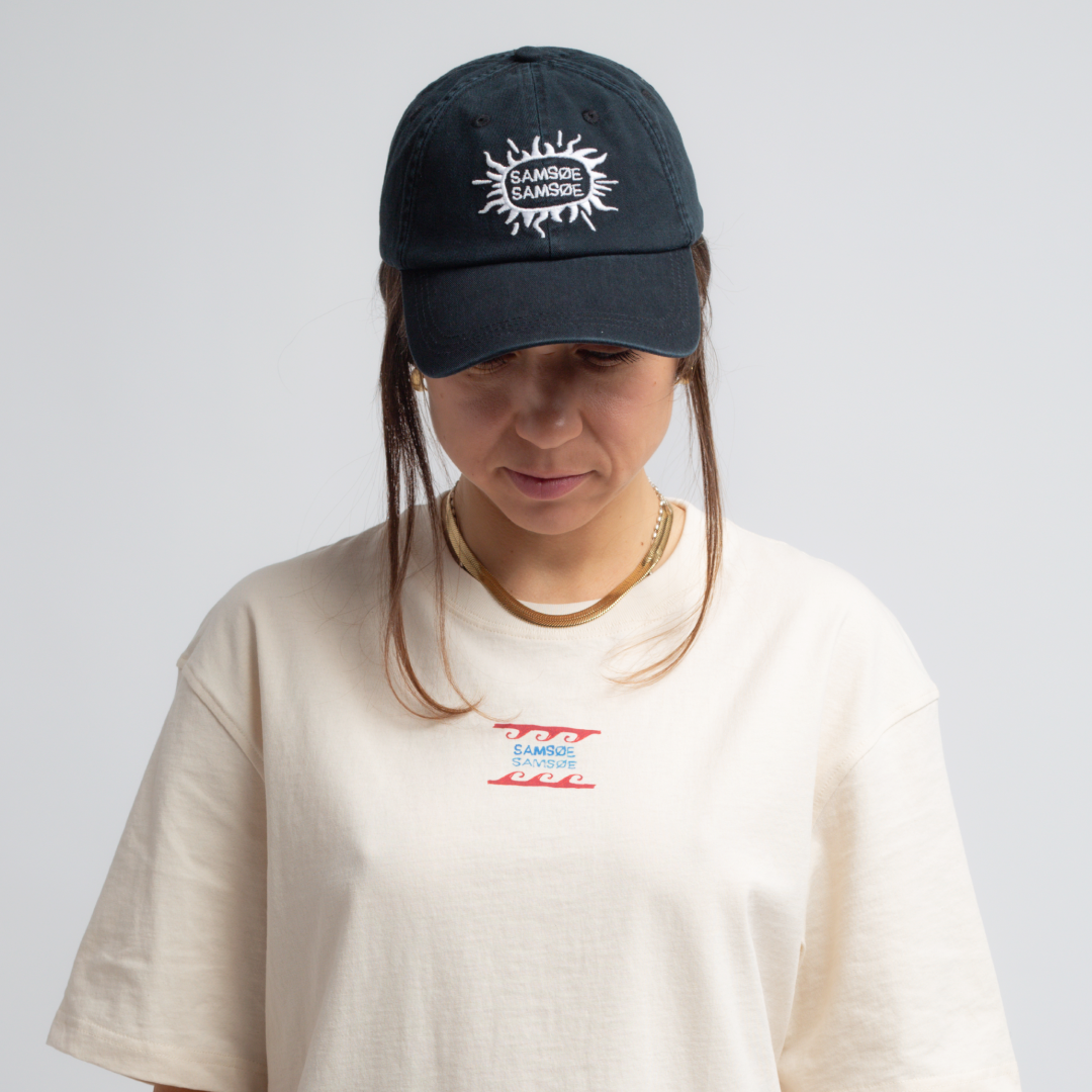 Czapka unisex typu baseball o klasycznym kroju. Z tyłu regulacja na metalowy zatrzask z wygrawerowanym logo, u góry otwory wentylacyjne. Na froncie haftowane logo Samsøe Samsøe. Wykonana w 100% z bawełny organicznej.