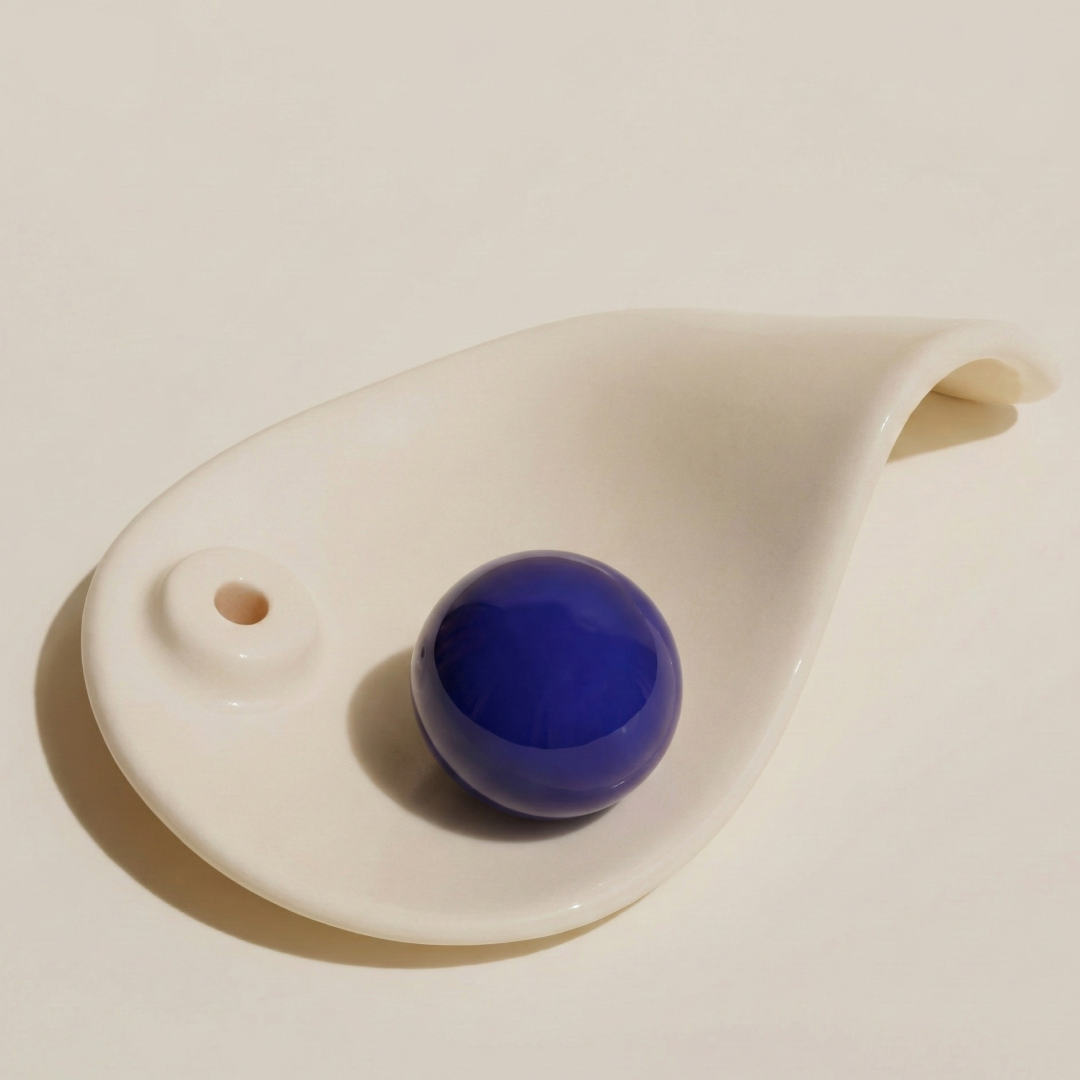 Podstawki pod kadzidła marki Auura zaprojektowane we współpracy z Malwiną Konopacką łączą w sobie funkcjonalność i dekoracyjny charakter. Ich płynna, owalna forma inspirowana jest linią unoszącego się dymu, a delikatna kulka stanowi subtelny akcent, który podkreśla wyjątkowość projektu.
