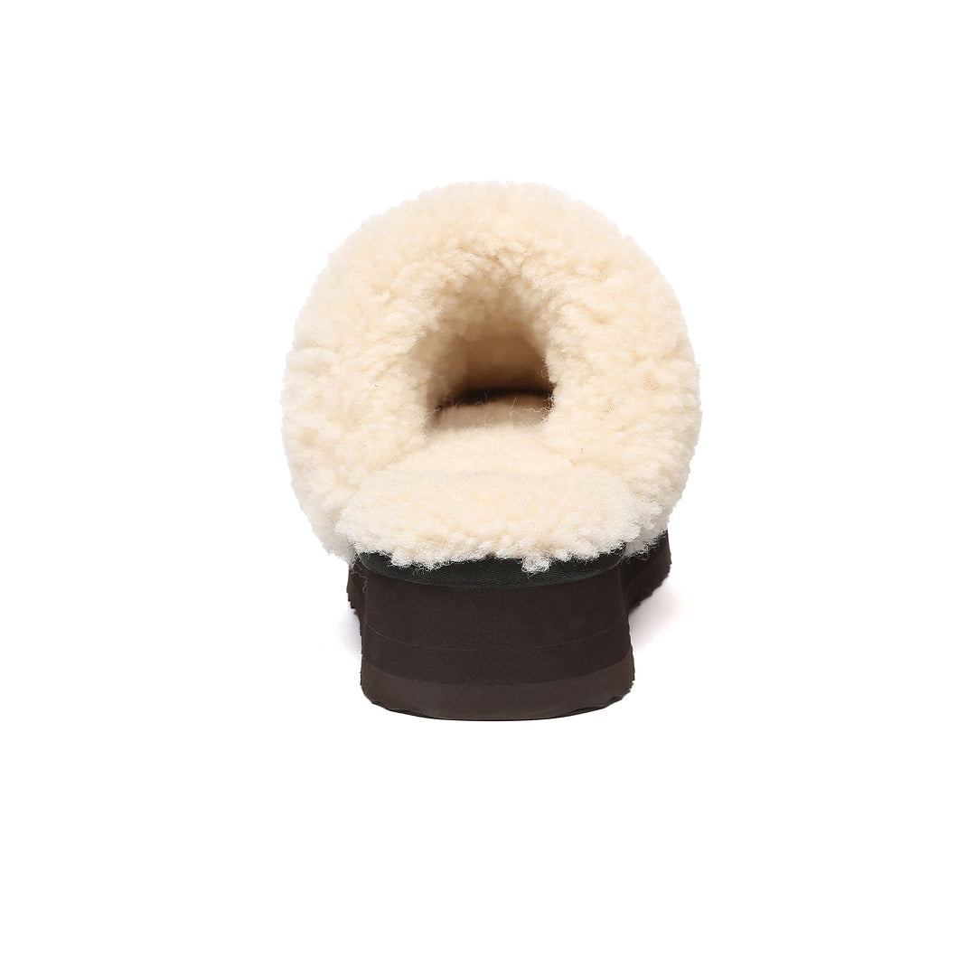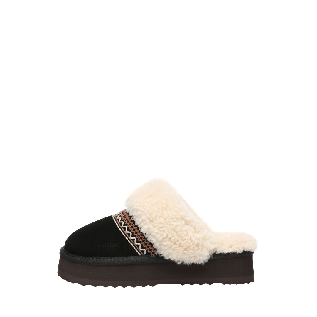 Crake Platform Slippers - to buty, które wyglądają jak gotowa stylizacja. Czarne, proste z zewnątrz, ale z miękkim, kremowym wykończeniem, które od razu robi efekt „otulenia”. W środku wełniany kożuch merino — ciepły, miękki i przyjemny w noszeniu. Szeroki pasek z haftowanym detalem dodaje charakteru, a platforma pod spodem sprawia, że sylwetka jest bardziej wyrazista i stabilniejsza w codziennym chodzeniu.