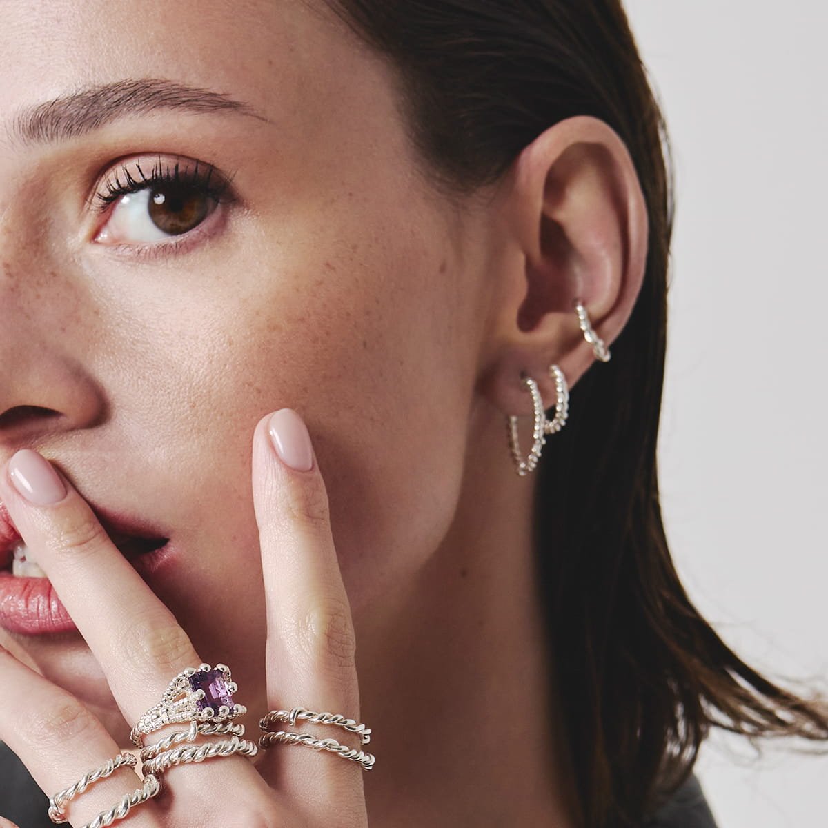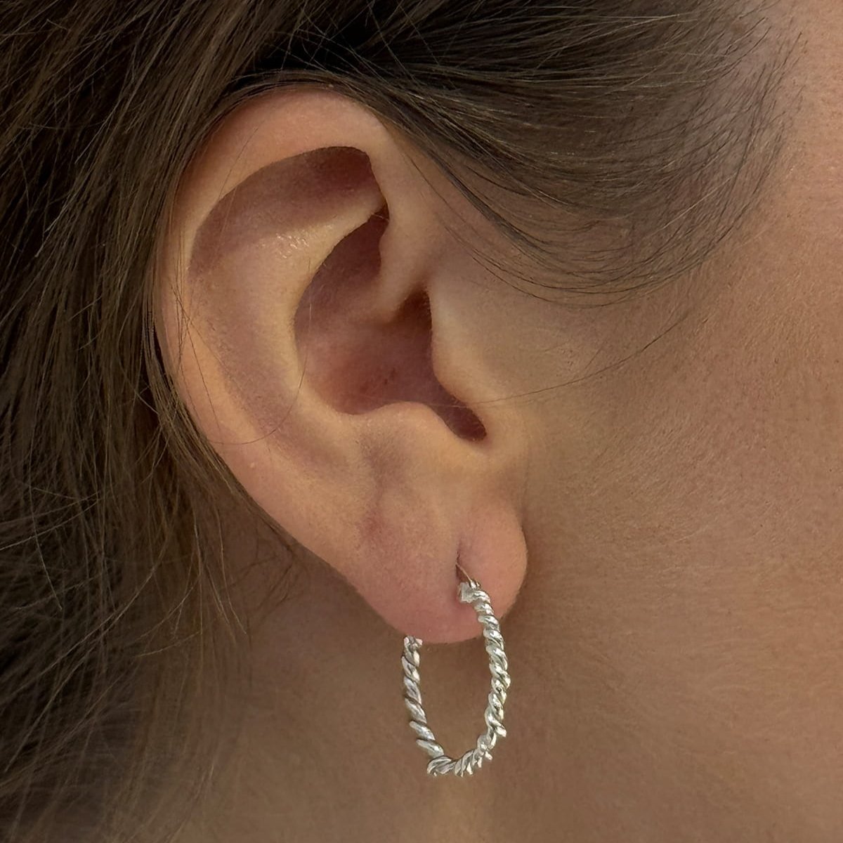 Kolczyki Maar Hygge to duże srebrne koła przypominające kształtem nieregularną linę. Pasują do innych produktów Maar z tej serii. Wykonane ręczne ze srebra próby 925.