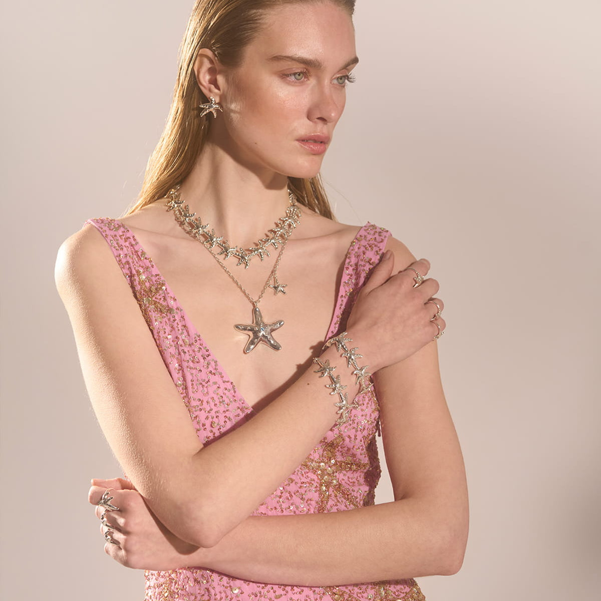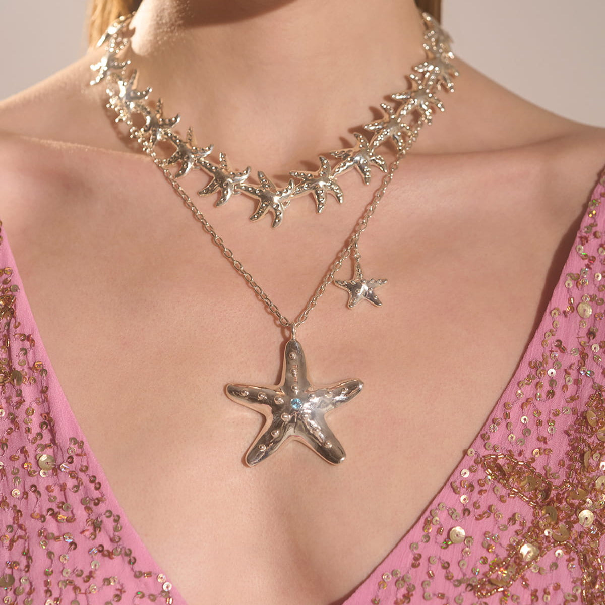 Naszyjnik z dużą rozgwiazdą z kuleczkami. Prototyp rozgwiazdy powstał metodą wosku traconego - został przez nas wyrzeźbiony ręcznie, a następnie odlany ze srebra. Dodatkowo rozgwiazdę ozdobiliśmy kamieniem naturalnym - pięknym błękitnym topazem.
