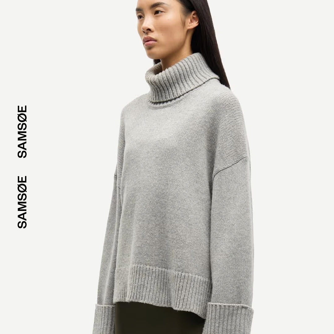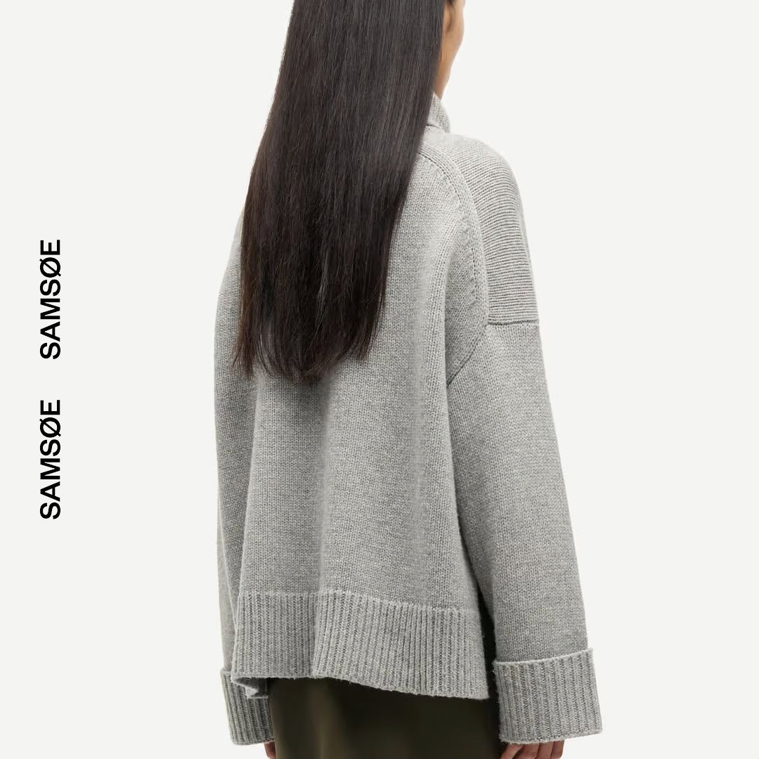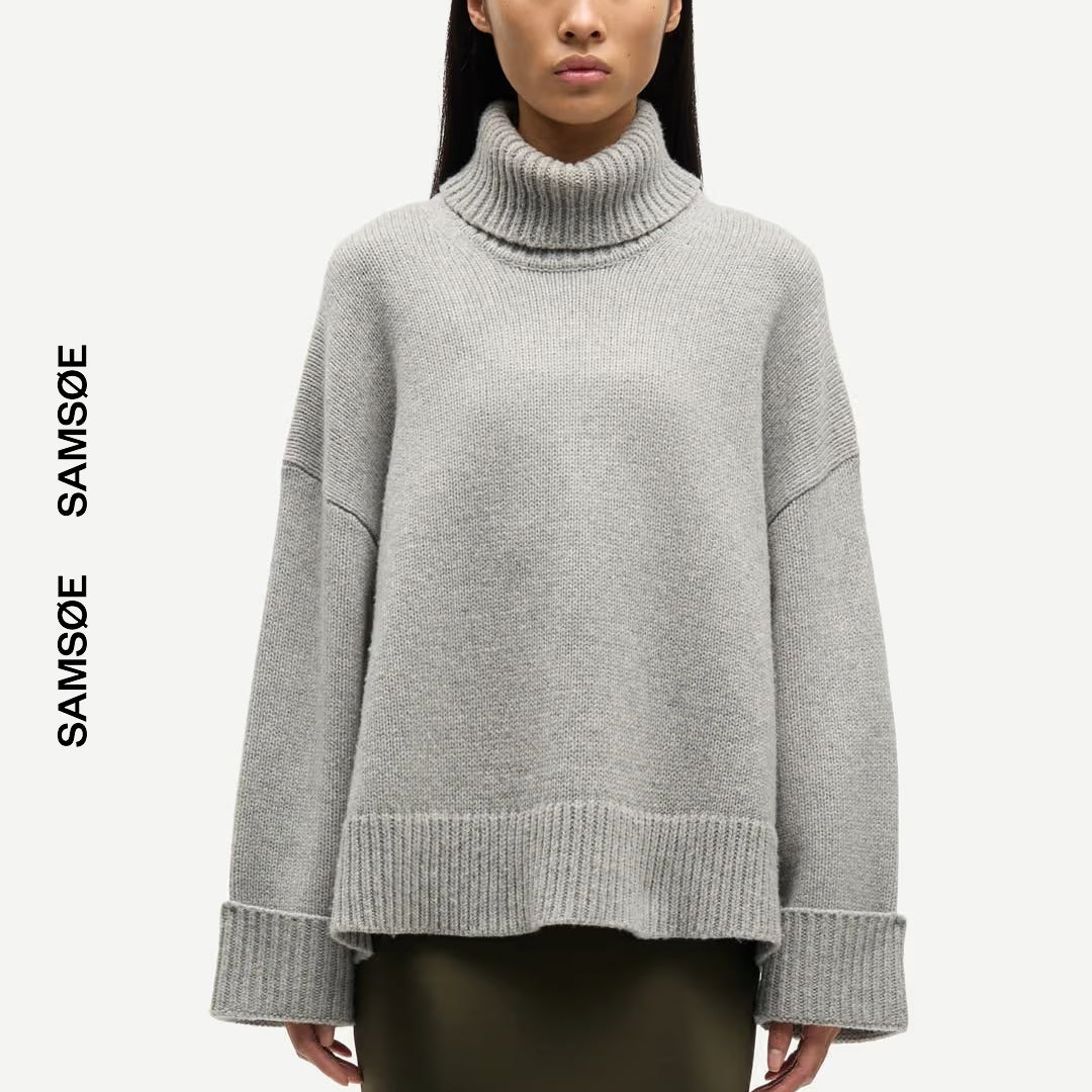 Golf SAKEIKU SAMSØE SAMSØE, w którym chcesz spędzić całą jesień i całą zimę. To co go wyróżnia to krój oversize z rozcięciami po bokach, które sprawiają, że opada luźno na biodra.