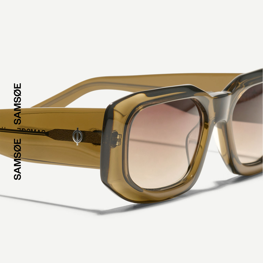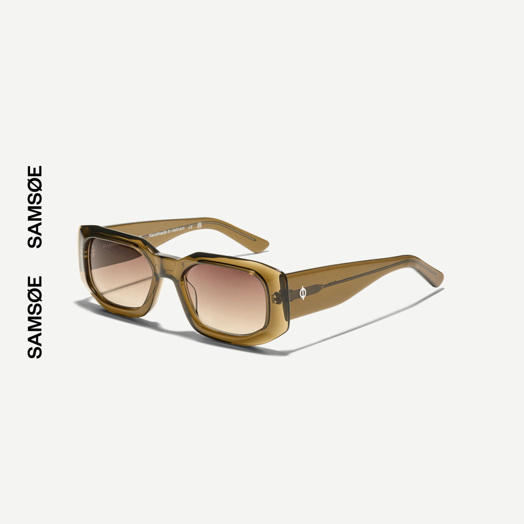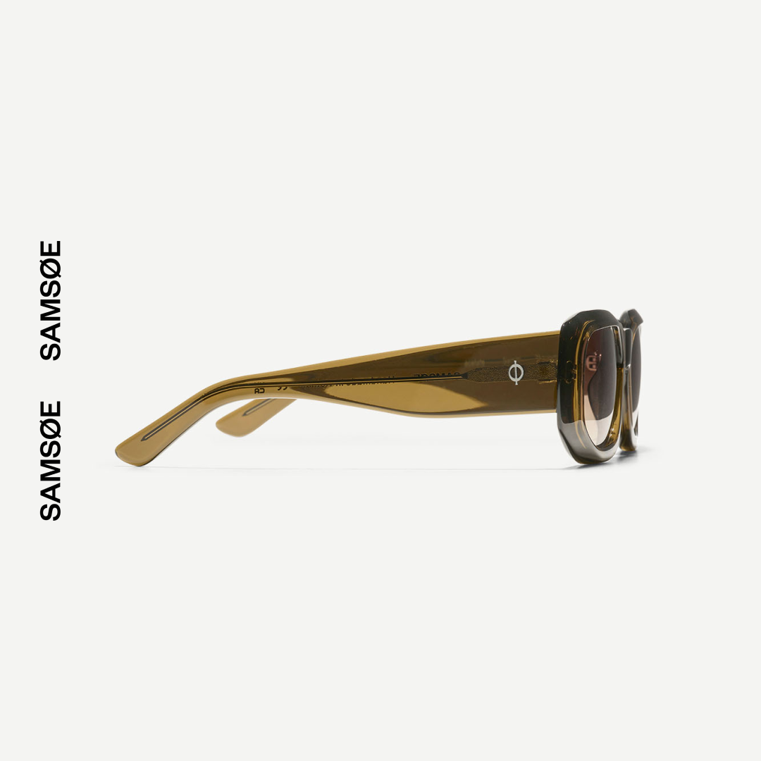 Unisexowe okulary przeciwsłoneczne o prostokątnym kształcie i przyciemnianych soczewkach. Szeroka oprawka została wykonana w 100% z acetatu z serii Renew (częściowo z recyklingu), a na zausznikach znajduje się subtelne logo ø. W zestawie etui i ściereczka z brandingiem Samsøe Samsøe.