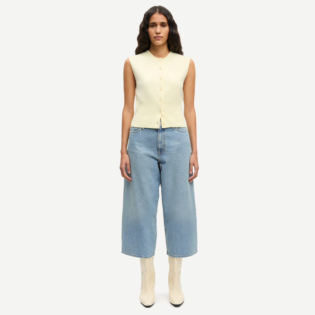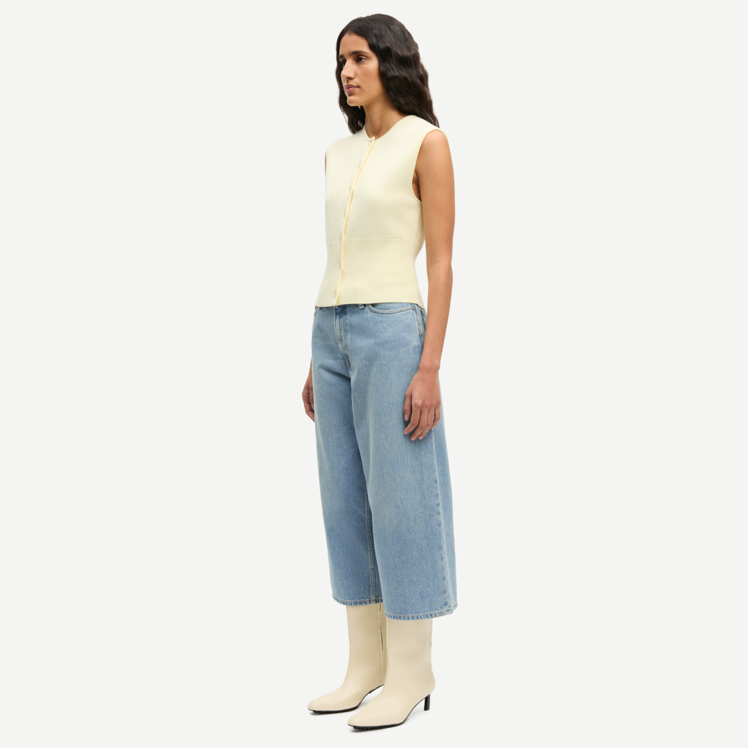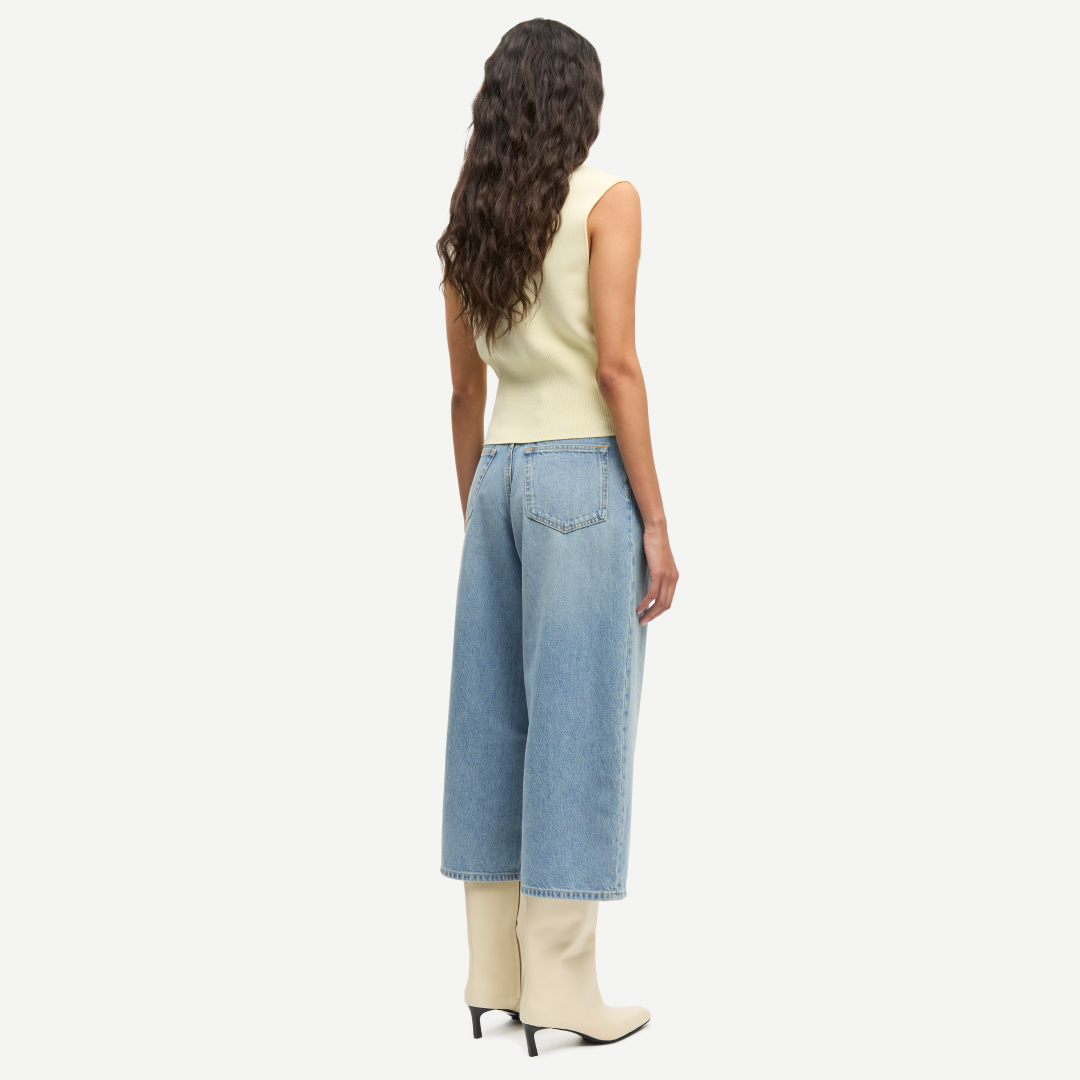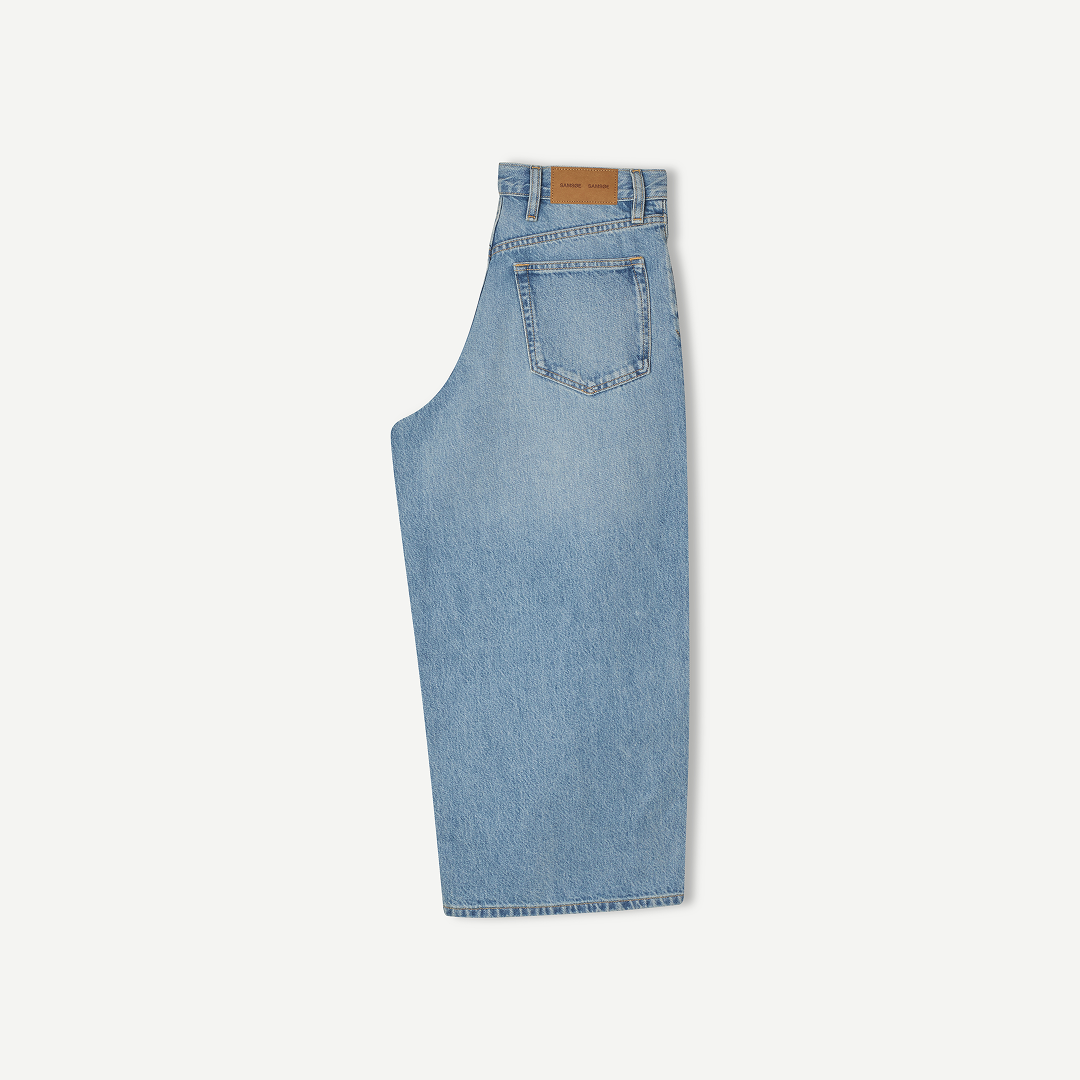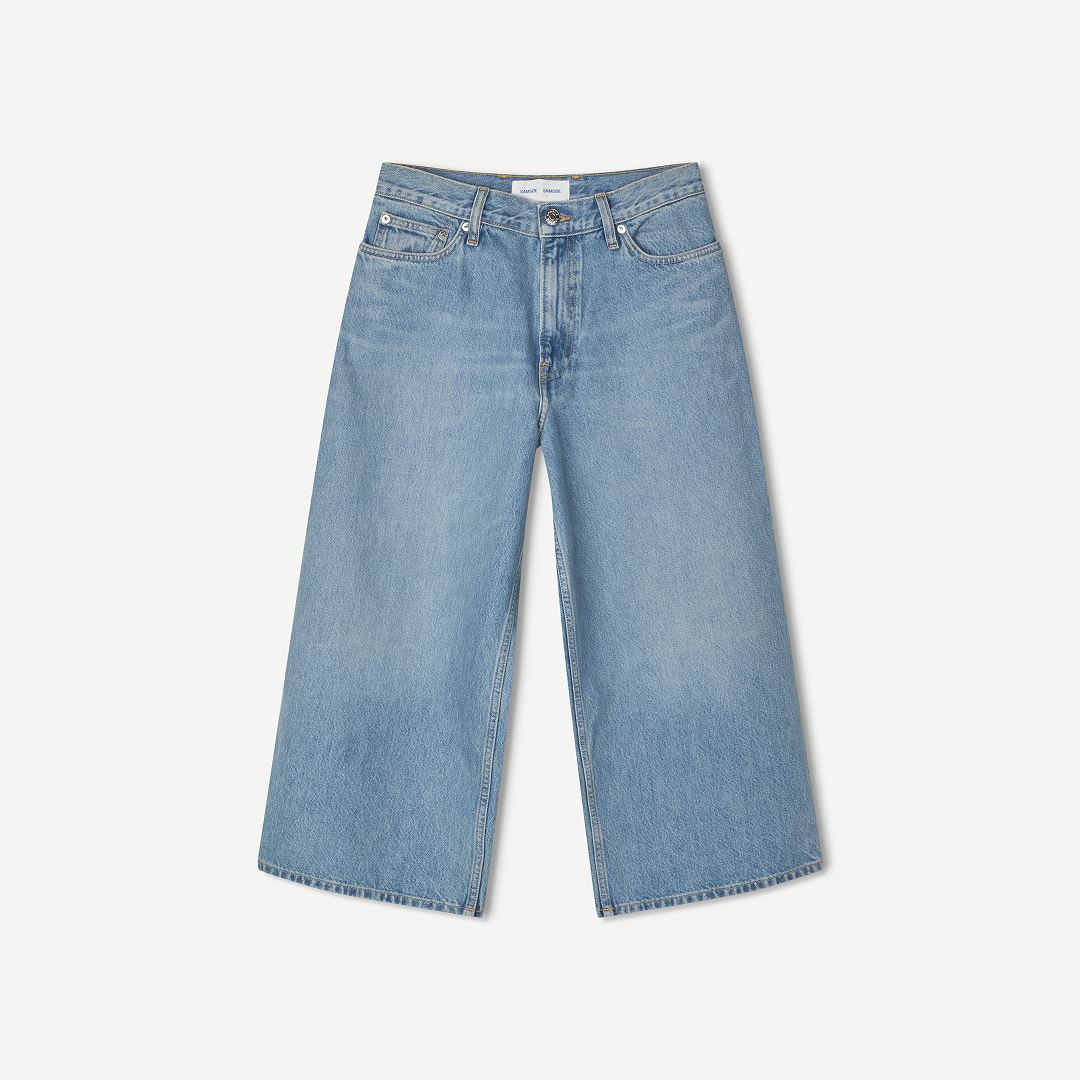 Jeansy typu culotte o średnim stanie, luźnym kroju i lekko zaokrąglonej nogawce. Zapięcie na guzik i suwak z przodu. Klasyczny fason z pięcioma kieszeniami, szlufkami oraz cienkim, dopasowanym paskiem. Wykonane z mieszanki bawełny organicznej i bawełny z recyklingu.