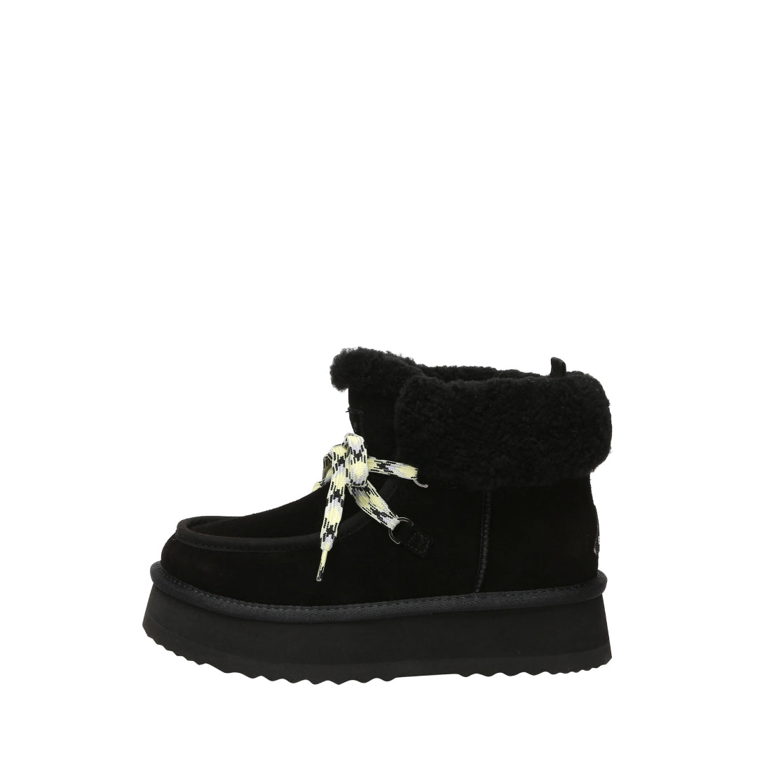 Lapwing Ankle Platform - to botki o wysokości "za kostkę" na platformie, które łączą klasyczną, zamszową cholewkę z wyraźnie „cozy” wykończeniem. Otulający kożuch merino przy kostce oraz dekoracyjne wiązanie z przodu dodaje charakteru i przyciąga wzrok. To model, który wygląda efektownie bez przesady i świetnie sprawdza się w chłodniejsze dni.